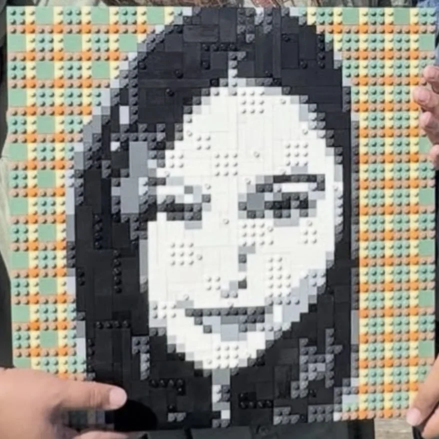 Each portrait is a detailed, hand-built process. The digital design and rendering stage usually takes 1 week, depending on the photo and design complexity. Once the layout is approved, the physical build can take another 1 to 2 weeks, since every brick — more than 1,000 pieces on a standard 48×48 portrait — is carefully hand-laid and aligned on the grid.